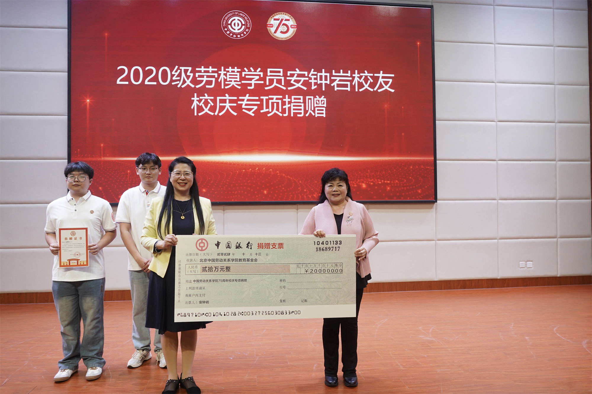 会上,刘丽红副校长代表学校接收北京丰顺工贸集团董事长、2020级劳模校友、学校基金会校友理事安钟岩20万元专项捐赠。安钟岩校友深情表达了对母校的深厚情感,并强调了企业家肩负的社会责任,表示将全力以赴地经营好企业,力求为母校、为社会做出更多贡献与回馈。