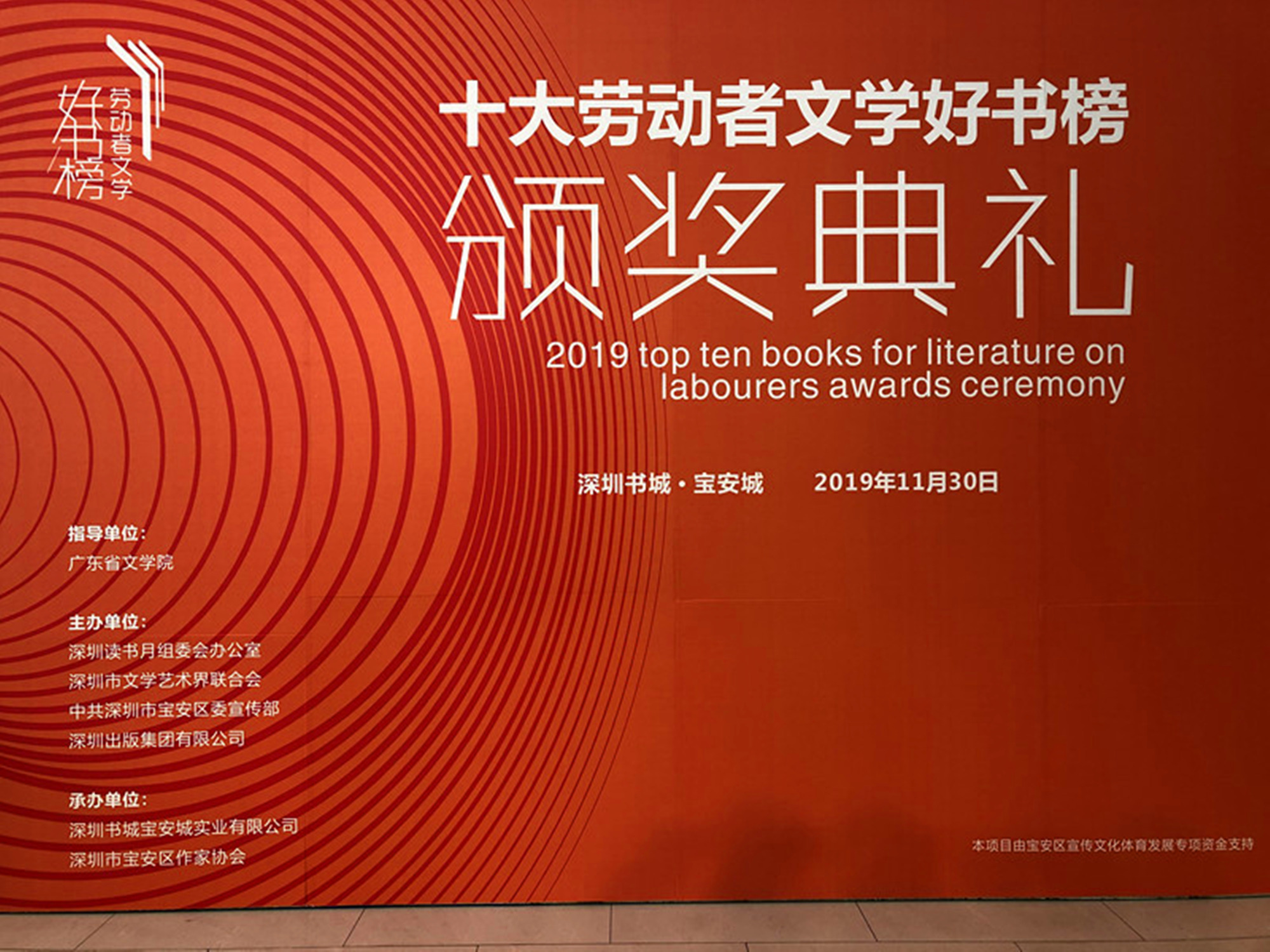 11月30日上午,为深入贯彻党的十九大精神,以习近平新时代中国特色社会主义思想为指导,大力发展劳动者文学事业,充分发挥文学价值引导、精神引领、审美启迪等重要作用,推动劳动者文学事业从高原迈上高峰,2019年第二届“全国十大劳动者文学好书榜”评选及颁奖活动在深圳举行。