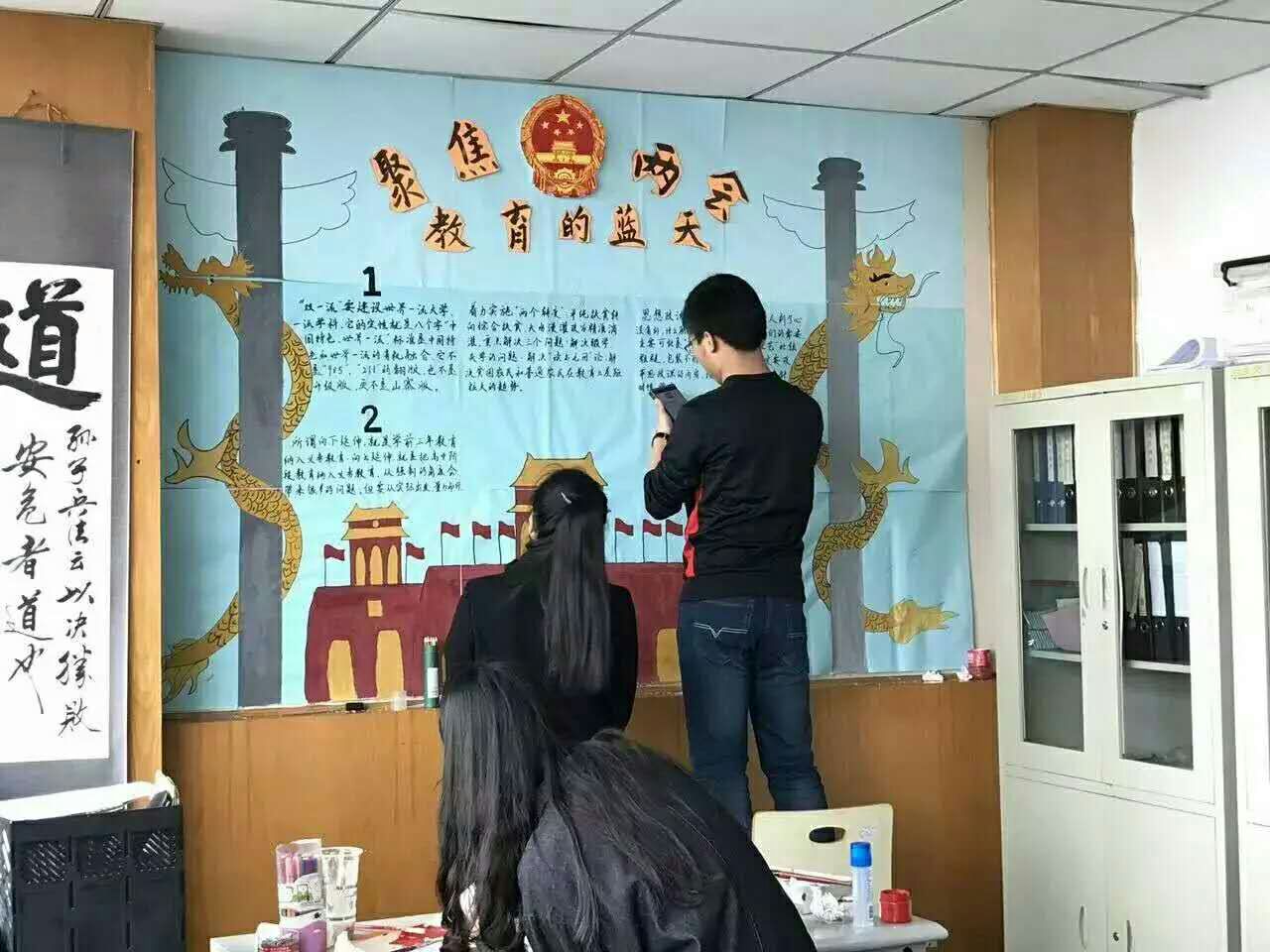 本次主题周由16级安工二班团支部先开始,紧紧围绕“安全”这一话题展开。此次主题板报分为两部分。第一部分是以蓝天作为背景,天安门为主题,凸显出蓝天下的天安门更加雄伟,柱子上缠绕着两条龙,凸显出勃勃生机。以两会为主题,一方面希望大家关注时事,关注两会;另一方面,让大家了解到教育的更新变革,了解青少年肩负的责任和使命。第二部分是以电脑为边框,中间的手机上微信朋友圈的发表,既彰显了创意性,又吸引了大家的眼球。针对当下时常发生的校园欺凌事件,到底这些事还是所谓的小打小闹么?遇到这些事,我们到底该怎么办呢?和谐校园,从我做起!