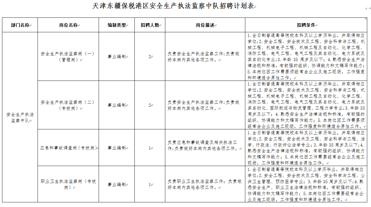 根据《天津市事业单位公开招聘人员实施办法(试行)》(津人社局发[2011]10号)规定,为进一步充实我区安全生产工作执法监察力量,确保人员素质,现开展天津东疆保税港区安全生产执法监察中队事业编制工作人员公开招聘工作。现将有关事项公告如下:
