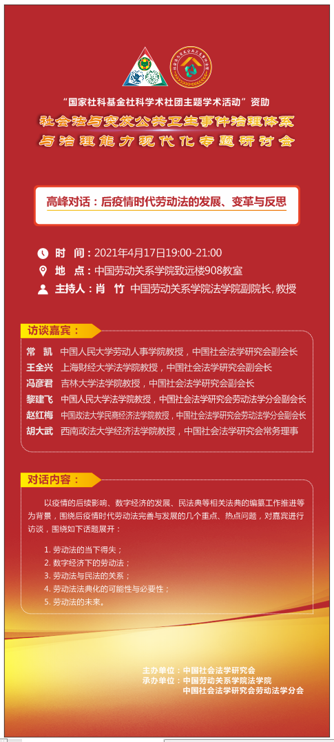 会议内容:以疫情的后续影响、数字经济的发展、民法典等相关法典的编纂工作推进等为背景,围绕后疫情时代劳动法完善与发展的几个重点、热点问题,对嘉宾进行访谈,围绕如下话题展开: