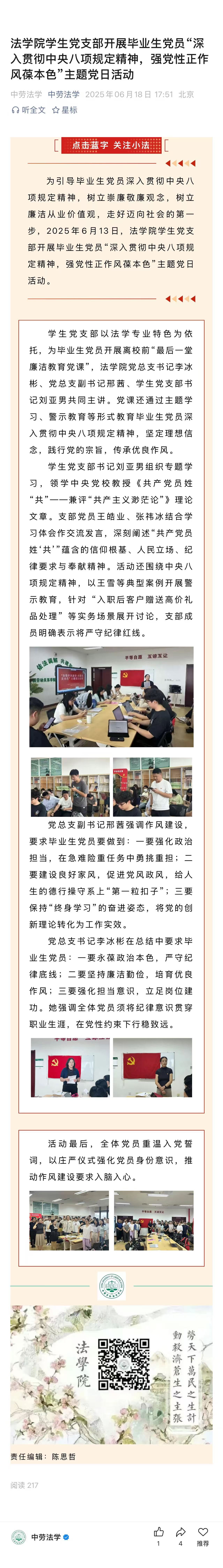 法学院学生党支部开展毕业生党员“深入贯彻中央八项规定精神,强党性正作风葆本色”主题党日活动