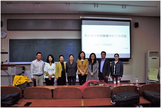 2019年4月26日晚,中国劳动关系学院法学院于北京校区阶梯二教室举办了劳动法前沿论坛(六)——“用人单位即时解雇中的法律风险”,本次论坛由中国社会法学研究会劳动法分会副会长、苏州大学王健法学院博士生导师沈同仙教授主讲,由中国劳动关系学院法学院肖竹副教授主持,中国劳动关系学院党委常委、法学院院长兼教务处处长姜颖教授、中央财经大学法学院沈建峰教授、同济大学法学院王倩副教授、中国劳动关系学院李文涛副教授,以及法学院、研究生院教师与学生共100余人参加了本次论坛。