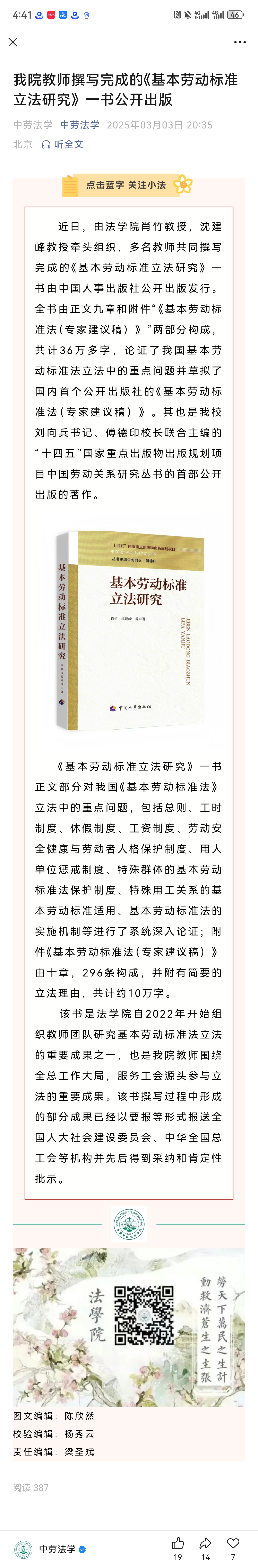 法学院教师撰写完成的《基本劳动标准立法研究》一书公开出版