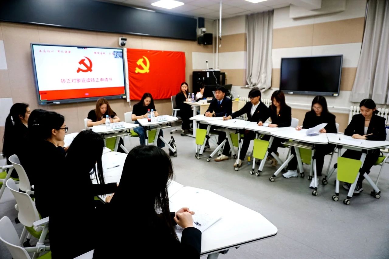 公共管理学院学生党支部预备党员转正大会暨毕业生党员离校教育会于6月20日在北京校区闻道楼112教室线上线下同步召开。学生党支部书记黄志惠老师,辅导员韩汝旭老师、刘博伟老师出席本次会议,全体学生党员、发展对象、入党积极分子参会,大会由学生党员王茗锾主持。此次大会的主题为讨论倪子航等10名预备党员的转正申请以及对2025届毕业生党员进行离校教育。