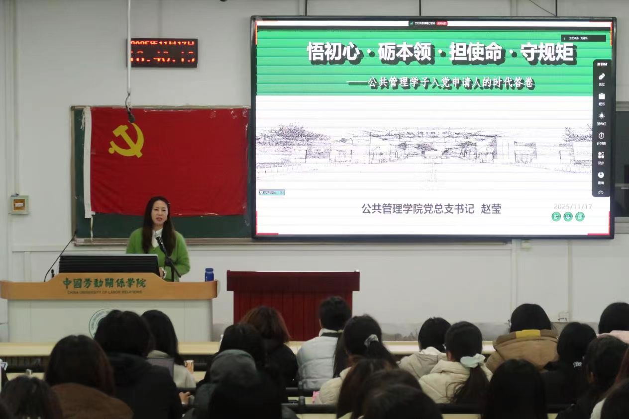 为端正入党申请人的入党动机,强化青年使命担当,夯实党员发展工作的思想基础,11月17日晚18:30,公共管理学院2025年秋季入党申请人培训班专题党课在涿州校区阶梯四教室与北京校区闻道楼108教室同步开展。本次专题党课由我院党总支书记赵莹主讲,两校区全体入党申请人参加学习。