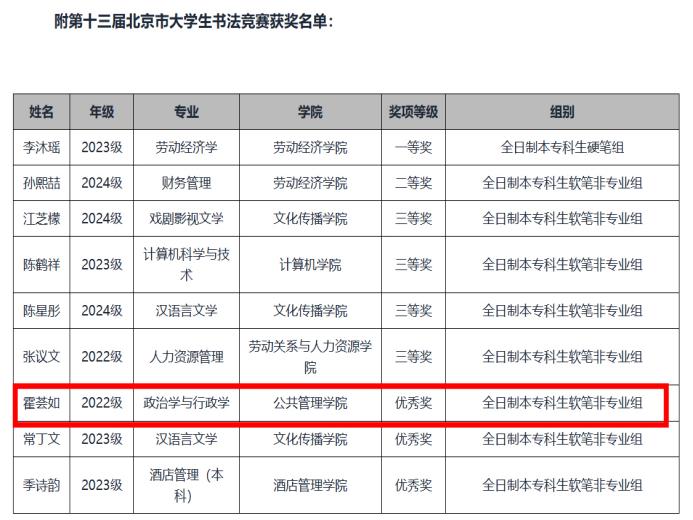 近日,第十三届北京市大学生书法大赛圆满落幕,我院2022级学生霍荟如从容执笔、沉着应战,在软笔非专业组中荣获优秀奖,展现出公管学子兼具理性素养与人文情怀的全面风采。