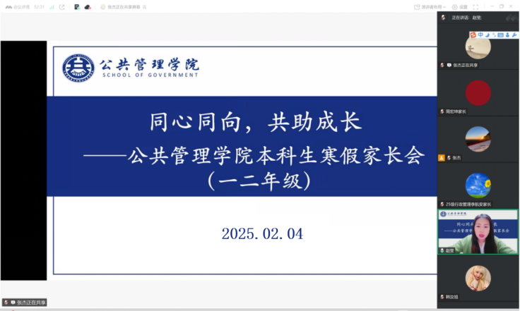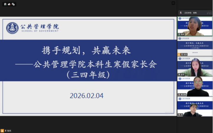 为搭建家校沟通桥梁,凝聚育人合力,助力学生明确学业方向、科学规划成长路径,我院于2月4日以线上形式分年级召开本科生寒假家长会。学院党总支书记赵莹、副书记兼行政副院长张杰,辅导员曾辉、韩汝旭、黄志惠、刘博伟员与本科生家长齐聚云端,共话学子成长与发展。