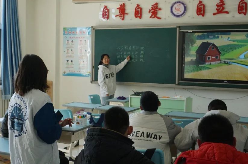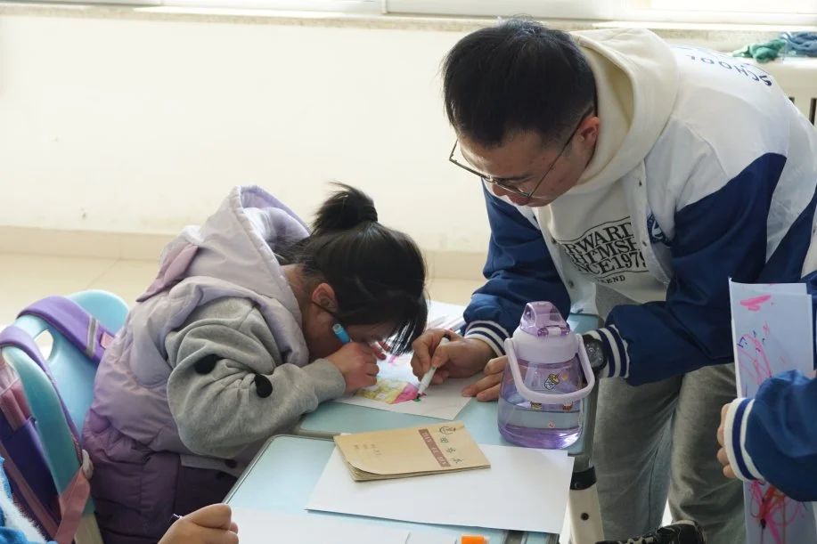 在明亮的教室里,志愿者与小朋友两两结伴,开启色彩之旅。他们用画笔尽情描绘心中的美好与期盼,现场充满欢声笑语。
