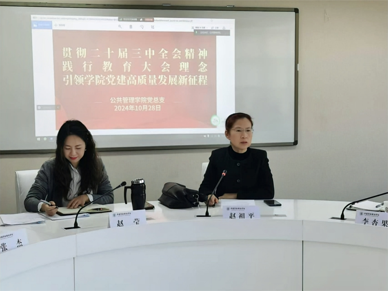 10月28日上午,公共管理学院在致远楼409召开“贯彻二十届三中全会精神,践行教育大会理念,引领学院党建高质量发展新征程”专题会议。学院全体教工党员参加会议,会议由党总支书记赵莹主持。
