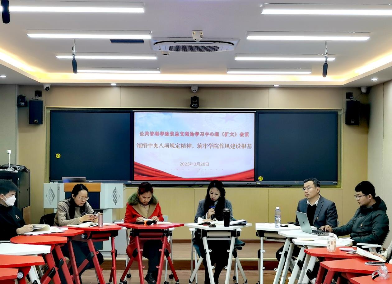 3月28日下午,公共管理学院党总支举办“领悟中央八项规定精神,筑牢学院作风建设根基”理论学习中心组(扩大)学习活动。会议由学院党总支书记赵莹主持,全体教工党员参加会议。