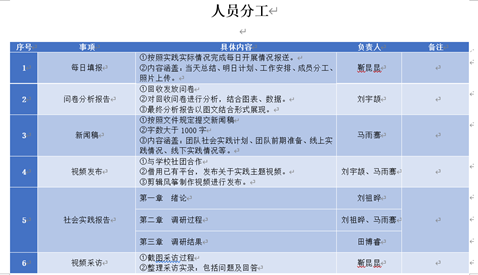 第三,根据团队实际实践情况及每日实践推进进度报送每日填报记录。同时,合理规划团员成员分工,按照规划进度,有序完成实践调研报告及新闻稿拟写。