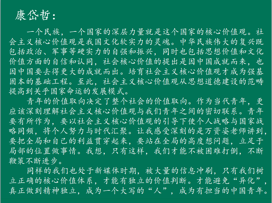 近日,习近平总书记给北京大学援鄂医疗队“90后”党员回信更是坚定了我们青年要自觉践行社会主义核心价值观的信念。相信通过聆听此次讲座,同学们对于社会主义核心价值观有了更深入的理解,深刻体会到青年积极践行社会主义核心价值观对于国家发展、社会进步和个人成长的建设性作用,进一步明确了自己前进的方向,今后将朝着自己的梦想不断努力。