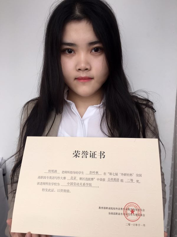 近日,第七届“外研社杯”全国高职高专英语写作大赛(北京赛区复赛)在北京经济管理职业学院举办,我校高职学院旅游英语教研室精心挑选了优秀选手参赛。最终,何明涛老师指导的15级酒店管理3班彭吟秋,梁毅老师指导的15级旅游管理2班窦明慧,在比赛中沉着冷静、认真答题,最终凭借扎实的写作基本功和超强的临场应变能力,一举获得北京赛区二等奖。