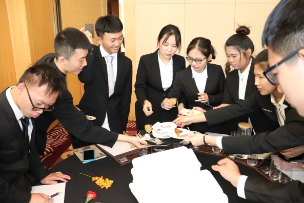 参观之旅将要结束之际,酒店还特意安排了工作人员为同学们准备了动手实践项:毛巾的花样折叠。酒店的夜床服务里,总会出现各种各样形状的毛巾,好看又有趣。酒店销售部总监带领大家一同来动手实践。最后,同学们将自己现场写的感谢卡贴到了一本感谢册上,并由学生代表赠予酒店。这是同学们最真挚的感谢,感谢酒店方所有工作人员的付出!本次参观令大一同学直击酒店现场工作,并同业界高级人才面对面在酒店交流,效果非常棒,同时也加强了校企合作的联结,感谢“万礼豪程”项目!