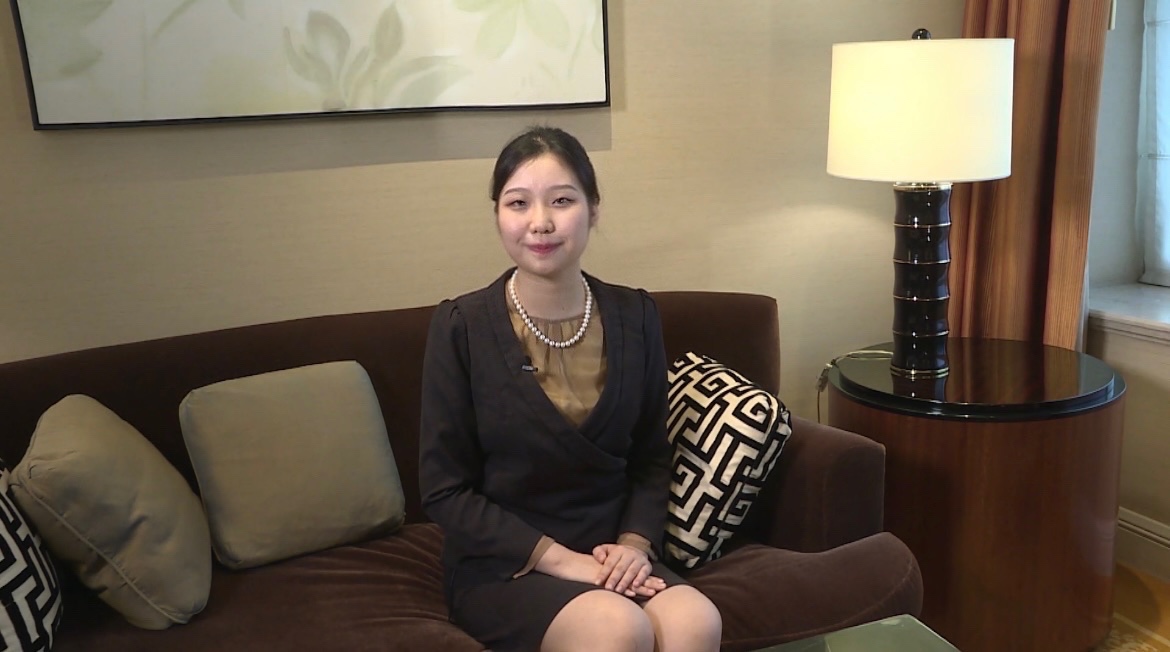 在自我介绍的环节,王淼同学和赵文滔同学分别在自己所实习的北京瑞吉酒店录制了90s的英文自我介绍短片。