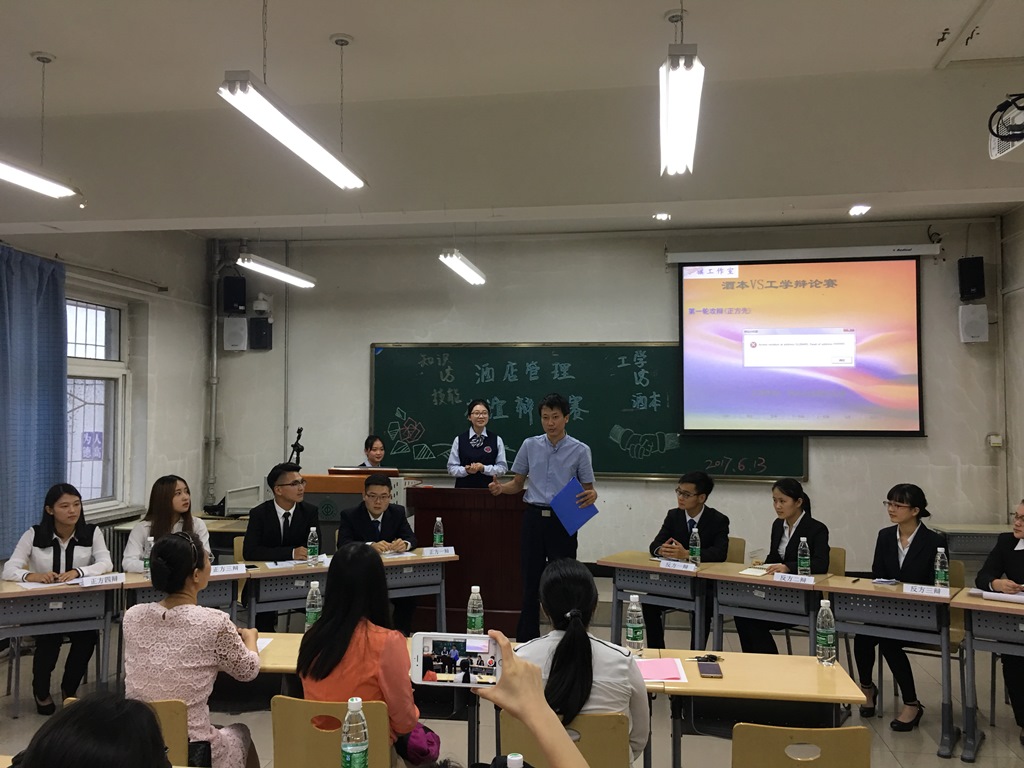2017年6月13日18点30分,在酒店管理教研室副主任党印老师的组织下,16级酒店管理本科班和16级酒店管理(工学结合)2班的“酒店管理专业友谊辩论赛”在二教113教室拉开帷幕。本次辩论赛围绕酒店行业中知识与技能的重要性。正方酒本班的辩题为“知识比技能更重要”,反方工学班的辩题为“技能比知识更重要”。主持人为工学班苏毓霖同学,计时人为酒本张心悦同学。辩论赛邀请到我院周敏慧、王慧慧、梁毅三位老师作评委,党印老师作点评。
