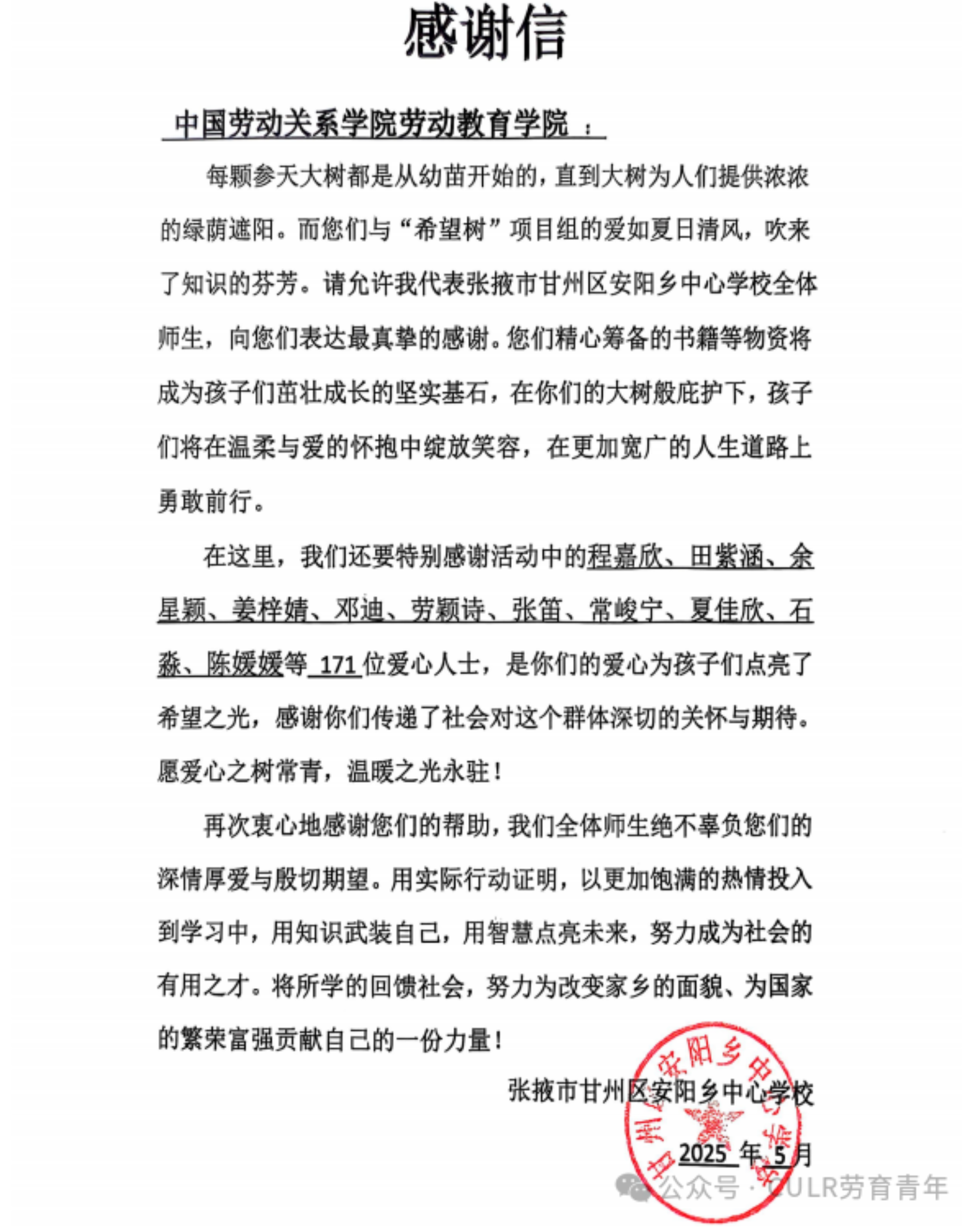 此次活动意义深远,书籍的传递让留守儿童感受到了来自社会的关爱和支持,也让参与活动的同学们获得了成长与进步。未来,劳动教育学院将持续关注留守儿童的阅读需求,为他们提供更多的帮助与支持,让爱心在传递中不断延续,从 “希望树” 成长为 “参天大树”,为更多孩子遮风挡雨,带来希望和力量。