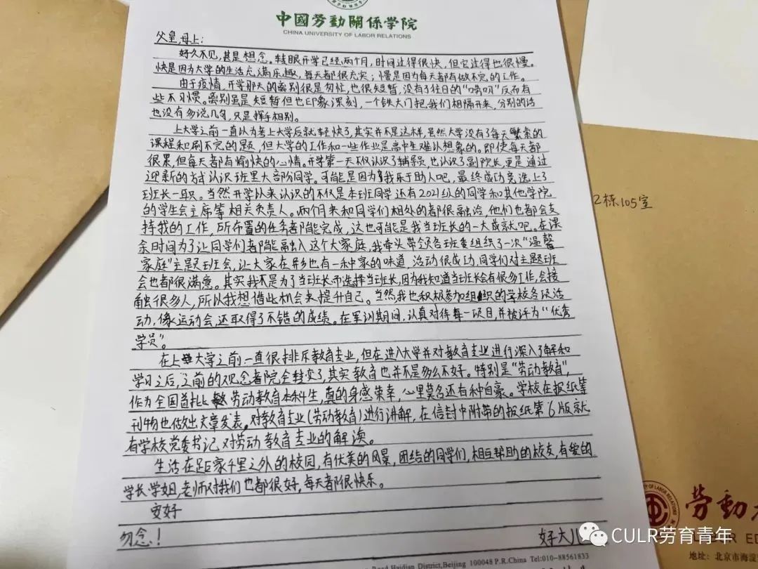 一封家书“报”平安,在信中我们装以《中国教育报》,报刊第6版报道了关于劳动教育专业建设如何发力的内容以及刘向兵书记《抓住劳动教育专业的三个关键点》的文章,这不仅提振了我校建成劳动和工会领域国内一流大学的信心,更是鼓足了我校冲击国际知名大学的干劲。一报一书信,解了亲人的惑,更暖了大家的心。
