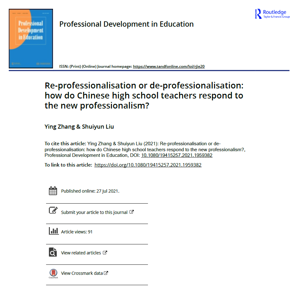 与以往读书会不同,本次读书会2021级研究生班主任张清宇老师特别邀请了首都经济贸易大学城市经济与公共管理学院的张颖老师为大家分享自己最新的研究成果,即2021年7月发表于SSCI期刊《Professional Development in Education》的一篇学术文章《Re-professionalisation or de-professionalisation: how do Chinese high school teachers respond to the new professionalism?》。学院2021级研究生焦丽作为学生代表,深入分享了自己阅读文章后的心得体会,以及联系自己中学教师职业背景所引发的进一步思考。读书会仍以线上方式进行,由张清宇老师主持,教学副院长党印老师全程参与并做点评,全体研一学生和部分研二学生参会。