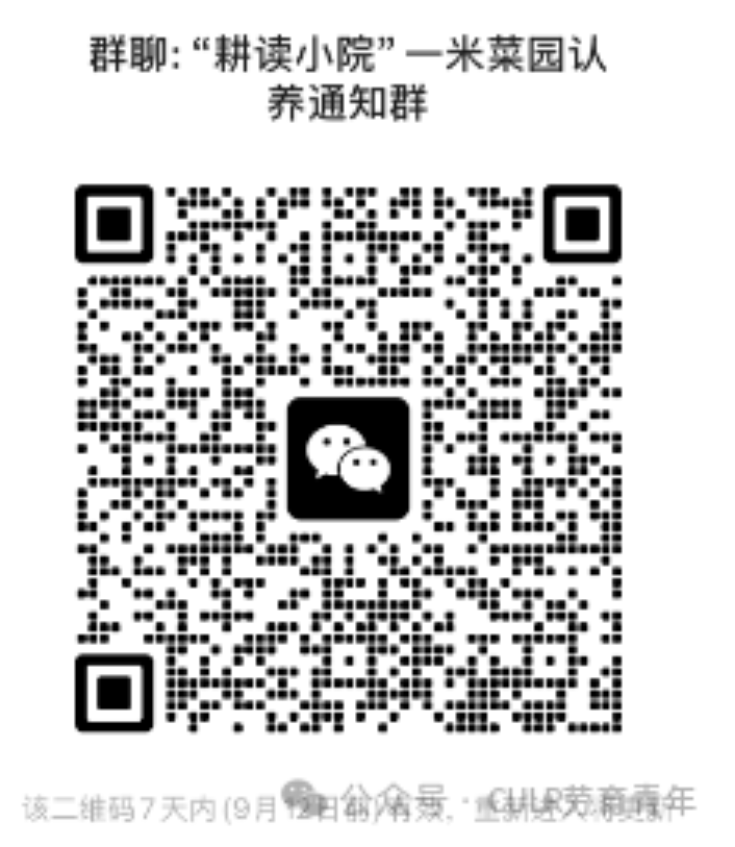 1.有意愿参与活动的同学填写附件《“耕读小院”一米菜园认养申请表》,发送至邮箱1494654489@qq.com,同时扫码加入活动官方群聊。