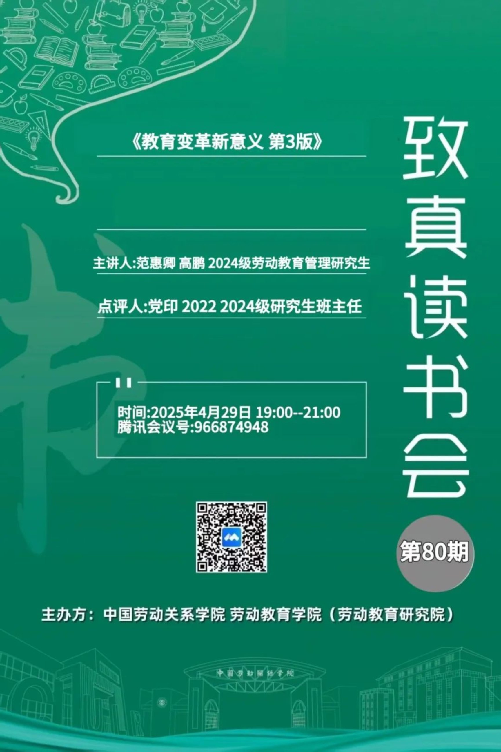 2025年4月29日晚,劳动教育学院在线举行第80期研究生“致真读书会”。2024级全体研究生线上参与,班主任党印老师主持读书会并做点评分析。