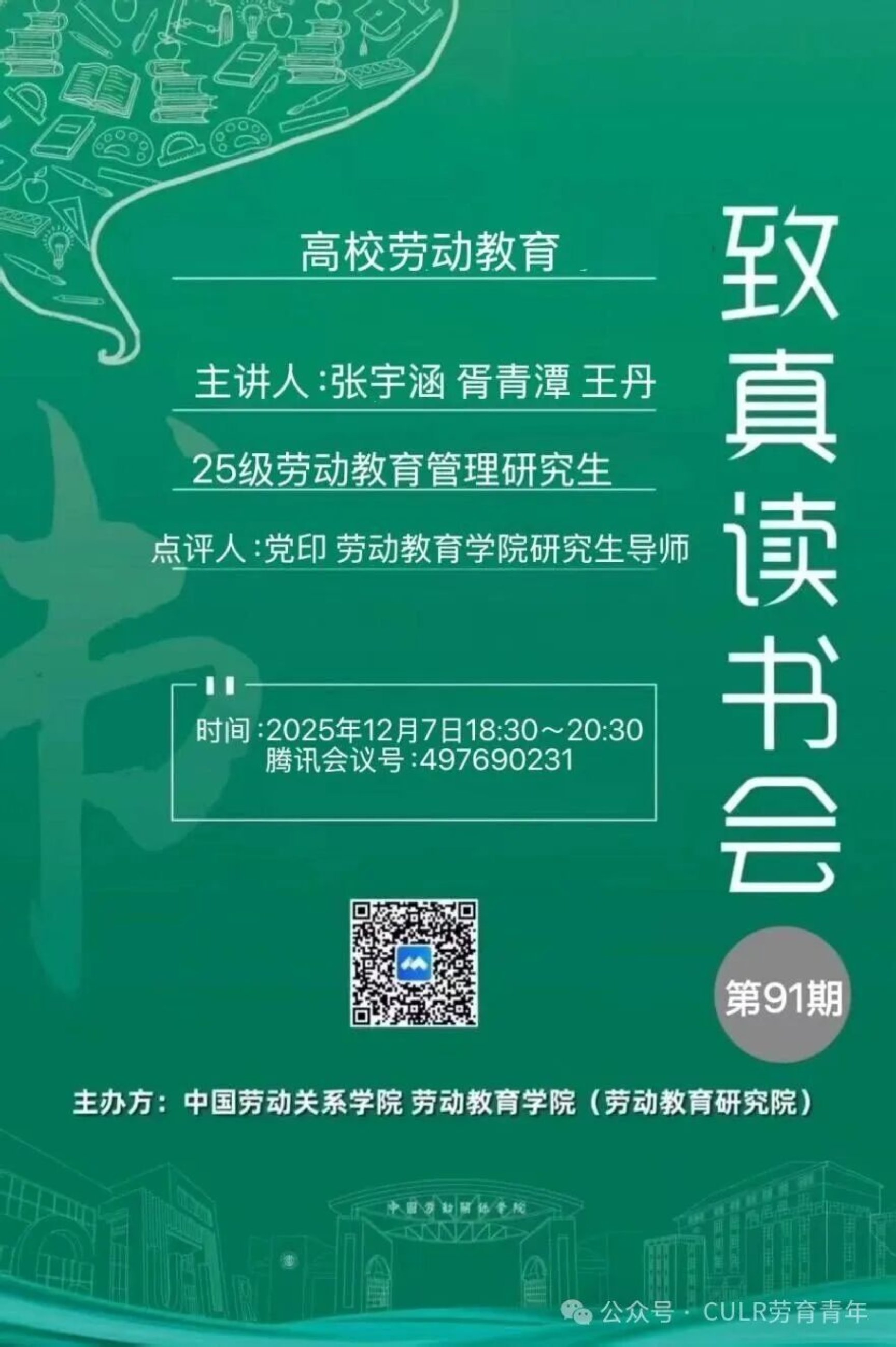 2025年12月7日晚,劳动教育学院在线举办第91期研究生“致真读书会”,2025级全体研究生参会。本期读书会学习刘向兵团队的三篇文章:《新时代高校劳动教育的新内涵与新要求》《新时代高校劳动教育的内涵辨析与体系建构》《构建新时代高校劳动教育体系的理论逻辑与实践路径》。