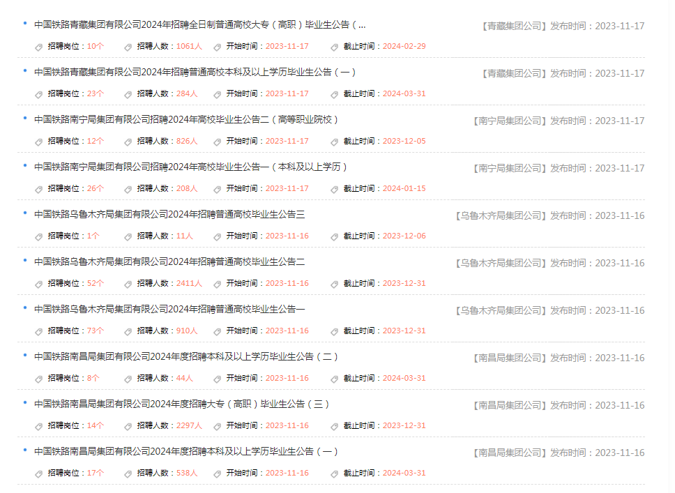 中国铁路人才招聘网是中国国家铁路集团有限公司及所属单位发布毕业生招聘公告的官方网站。中国国家铁路集团有限公司及所属单位在招聘过程中不向应聘毕业生收取中介费、咨询费、培训费、体检费等费用,不指定辅导用书,不举办任何形式的辅导培训班。也从未授权或委托第三方(含其他任何机构、个人)从事上述活动,请提高警惕,谨防受骗。