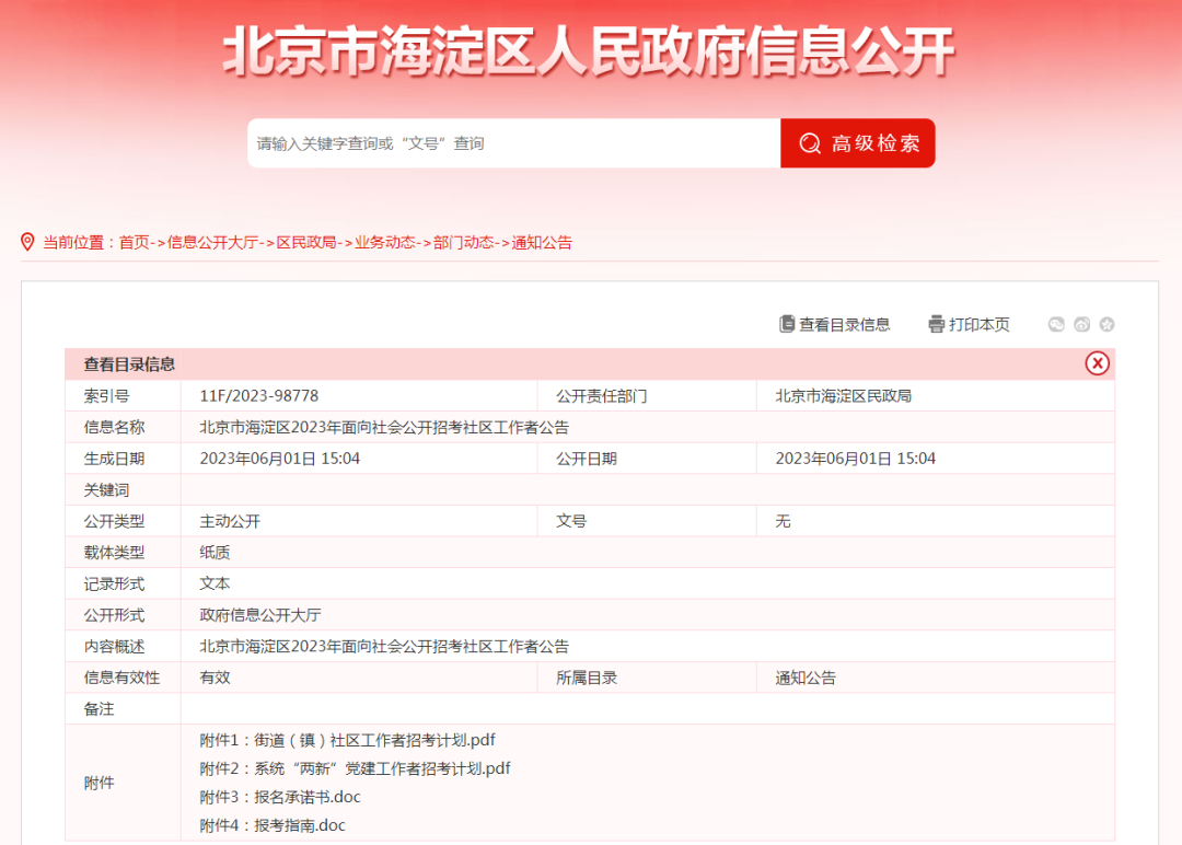 《北京市海淀区2023年面向社会公开招考社区工作者公告》
