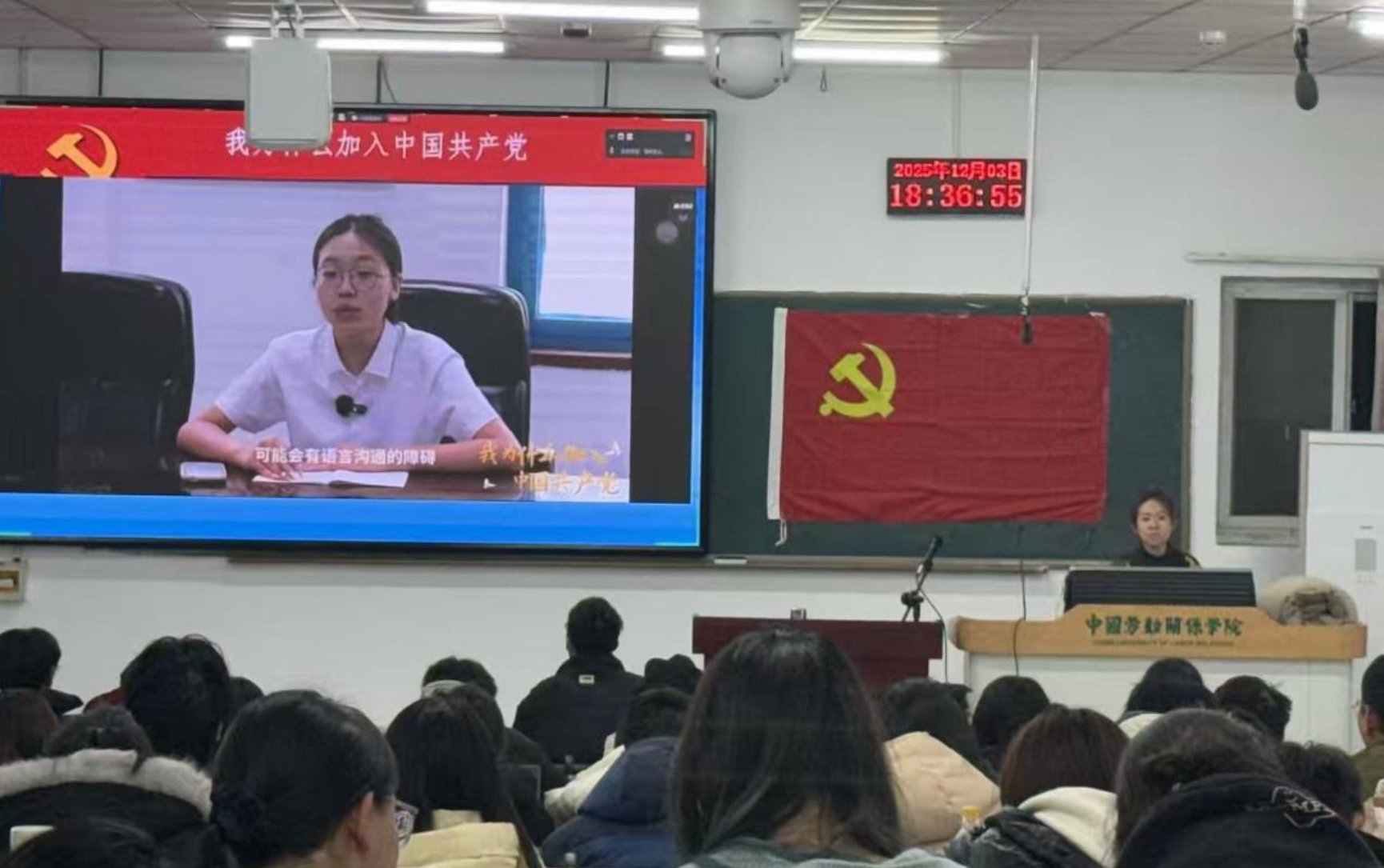 2025年12月3日晚,中国劳动关系学院劳动经济学院第27期业余党校第三讲在涿州校区阶梯三教室开讲。本次党课以“严格组织程序,做好发展工作”为主题,由涿州校区学生党支部书记安炳静主讲。现场气氛庄重而热烈,同学们认真聆听,系统学习了成为一名共产党员所必须经历的严格程序。