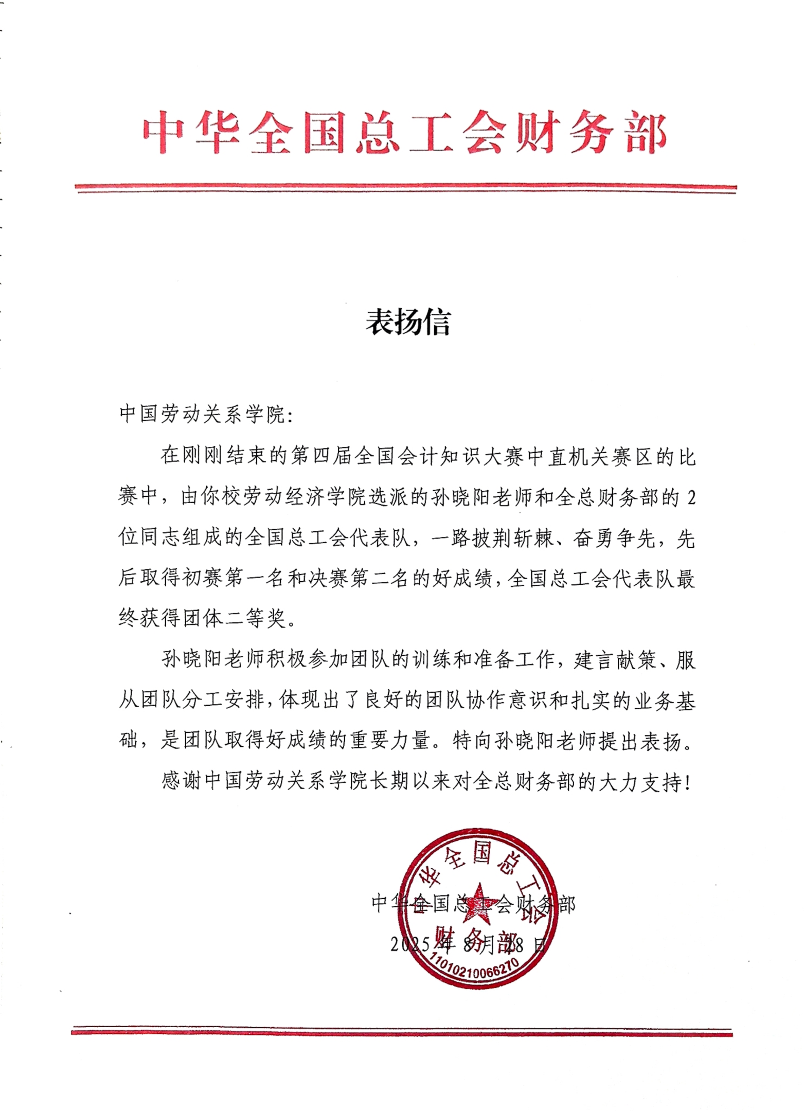 经过近2个月紧锣密鼓备赛,孙晓阳老师凭借深厚的理论功底与卓越的团队协作能力,与队友默契配合、奋勇拼搏,在7月26日初赛中,从82支参赛队伍中脱颖而出,以第一名的优异成绩成功晋级决赛;8月27日决赛中,面对7支精英队伍的激烈角逐,沉着应对、精准作答,赛出了工会实力、中劳风采,助力代表队荣获第二名佳绩,为全国总工会赢得团体二等奖殊荣。