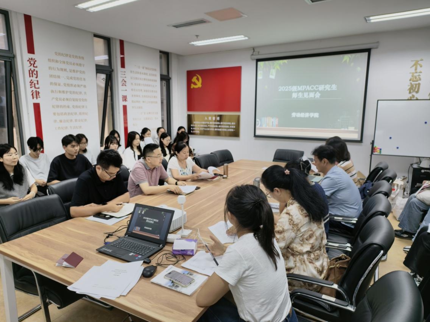 秋阳杲杲,丹枫迎秋。9月5日下午,致远楼607会议室内气氛热烈,劳动经济学院2025级会计专业硕士(MPACC)新生见面会在此隆重举行。此次见面会旨在搭建师生沟通的桥梁,帮助新生们更快地融入新环境、明确新目标。学院领导、硕士生导师及全体MPAcc新生齐聚一堂,共话未来。会议由劳动经济学院科研副院长(主持工作)赵明霏主持,教学副院长韩文琰、党总支副书记郭巍以及全体会计专业硕士导师参加会议。