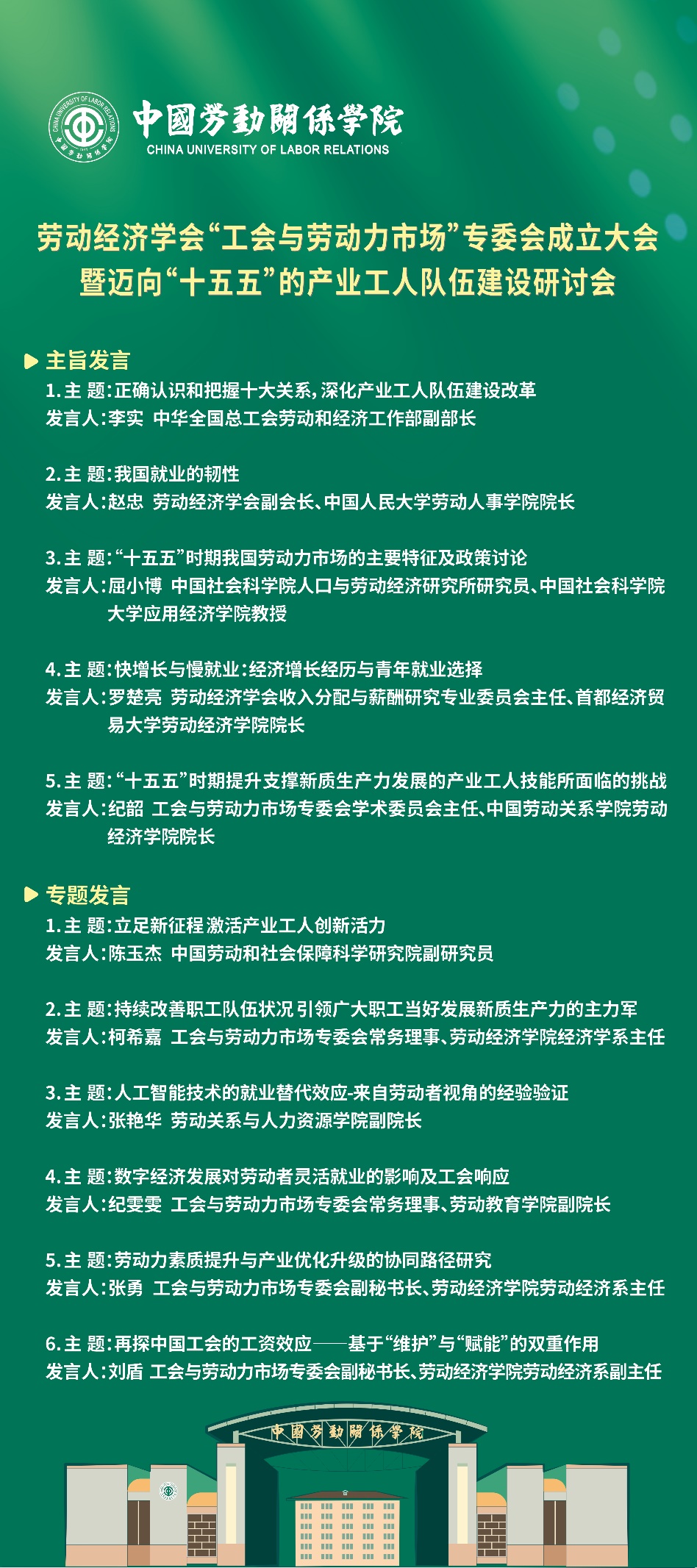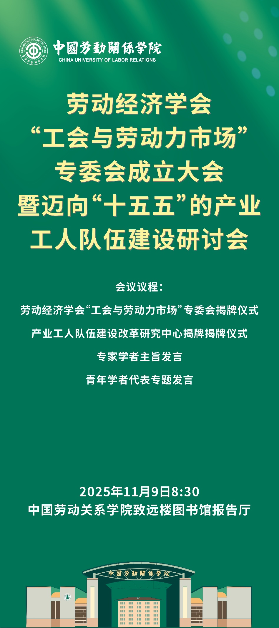 11月9日(周日)上午,劳动经济学院将举办劳动经济学会“工会与劳动力市场”专委会成立大会暨迈向“十五五”的产业工人队伍建设研讨会。会议邀请了全总领导、劳动经济学领域知名专家和我校学者参会交流,欢迎各位老师和同学们关注参加。