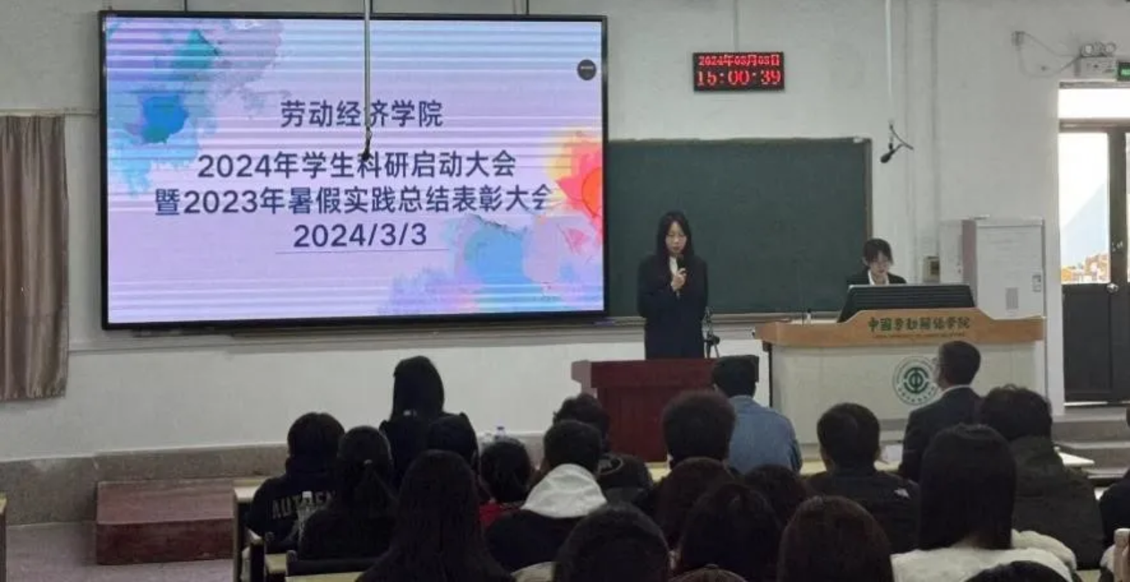 大会期间,劳动经济院对参与暑期社会实践并取得优异成绩的同学进行表彰。此外,为了提升我校本科生的创新创业和科学研究能力,让更多学生有机会得到科研训练、创新创业实践,为今后继续深造、创业、就业打下坚实基础,2024年我校校级学生科研项目立项总量100项,并依据人数在二级学院进行了细致地分配,为此我们邀请到了党总支副书记郭巍老师、劳动经济学院副院长王明哲老师、劳动经济学院教师谭超老师为与会同学进行细致讲解。