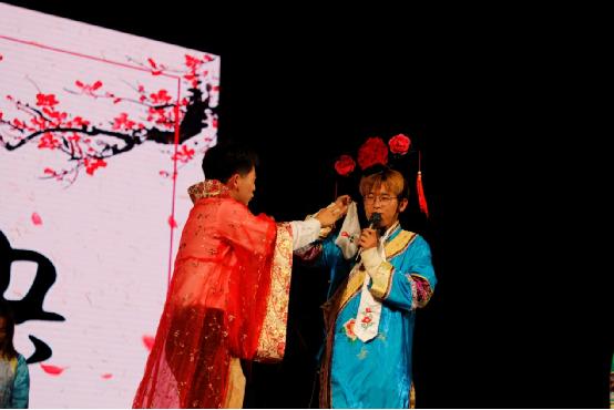 20级的陆雨诺、燕盈欣和19级的潘怡岑表演唱跳节目《牵丝戏》,优美的古典舞蹈和精妙的戏腔唱法让同学们在古风古韵之中感受老翁与木偶的牵恋。