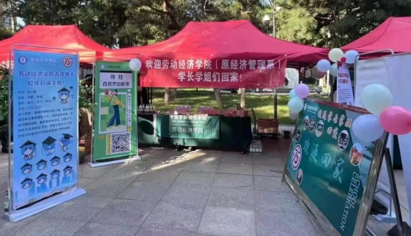 本次活动的劳动经济学院(原经济管理系)摊位由劳动经济学院校友会负责布置。在活动现场,校友会的工作人员与广大校友共享校庆喜悦,同时积极向校友们介绍我院“寻找百位杰出校友”计划,邀请各位校友参加留言签名活动并赠与他们院徽和纪念品宣传册,我院还展示了代表我院形象的新朋友——劳小鲸。此外,校友会还为即将于10月13日举行的校庆大典、校友大会、美育展演以及师生座谈会进行预热宣传,更为每位返校校友准备了精美文创纪念品,期待与每一位校友共同见证并参与这些精彩纷呈的庆典活动。