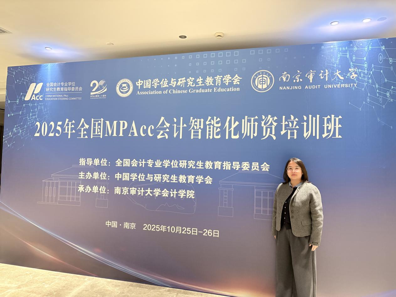 2025年10月25日-26日,由全国会计专业教育指导委员会指导、南京审计大学承办的“2025年全国MPAcc会计智能化师资培训班”顺利举行,为紧跟会计行业智能化发展趋势,提升MPAcc专业师资的数智化教学能力,我院韩文琰副院长和财务管理系教师孙晓阳赴江苏南京参会,共襄会计智能化转型盛举。