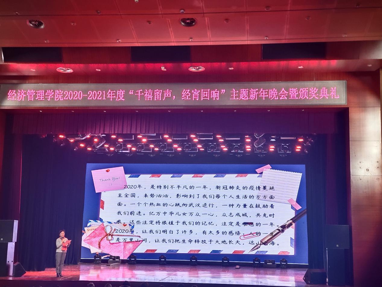 晚会开始之初,李淑玲书记上台代纪韶院长朗读了她给经管学子发来的新年贺词。这封贺词饱含了纪韶院长对我院同学们的殷切期望,在场的我们也理解纪韶院长因防控疫情而无法到场的遗憾。