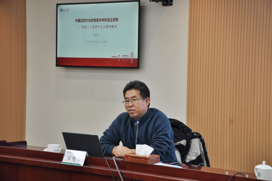 2025年11月26日下午,马克思主义学院在致远楼509会议室举办“学习贯彻党的二十届四中全会精神马克思主义学院院长系列讲坛”。本次讲座特邀北京大学马克思主义学院教授、博士生导师、副书记、副院长宋朝龙担任主讲,主题为“中国式现代化的制度本体与自主逻辑”。讲座由马克思主义学院院长许涛主持。马克思主义学院教师及学生代表现场聆听了讲座。