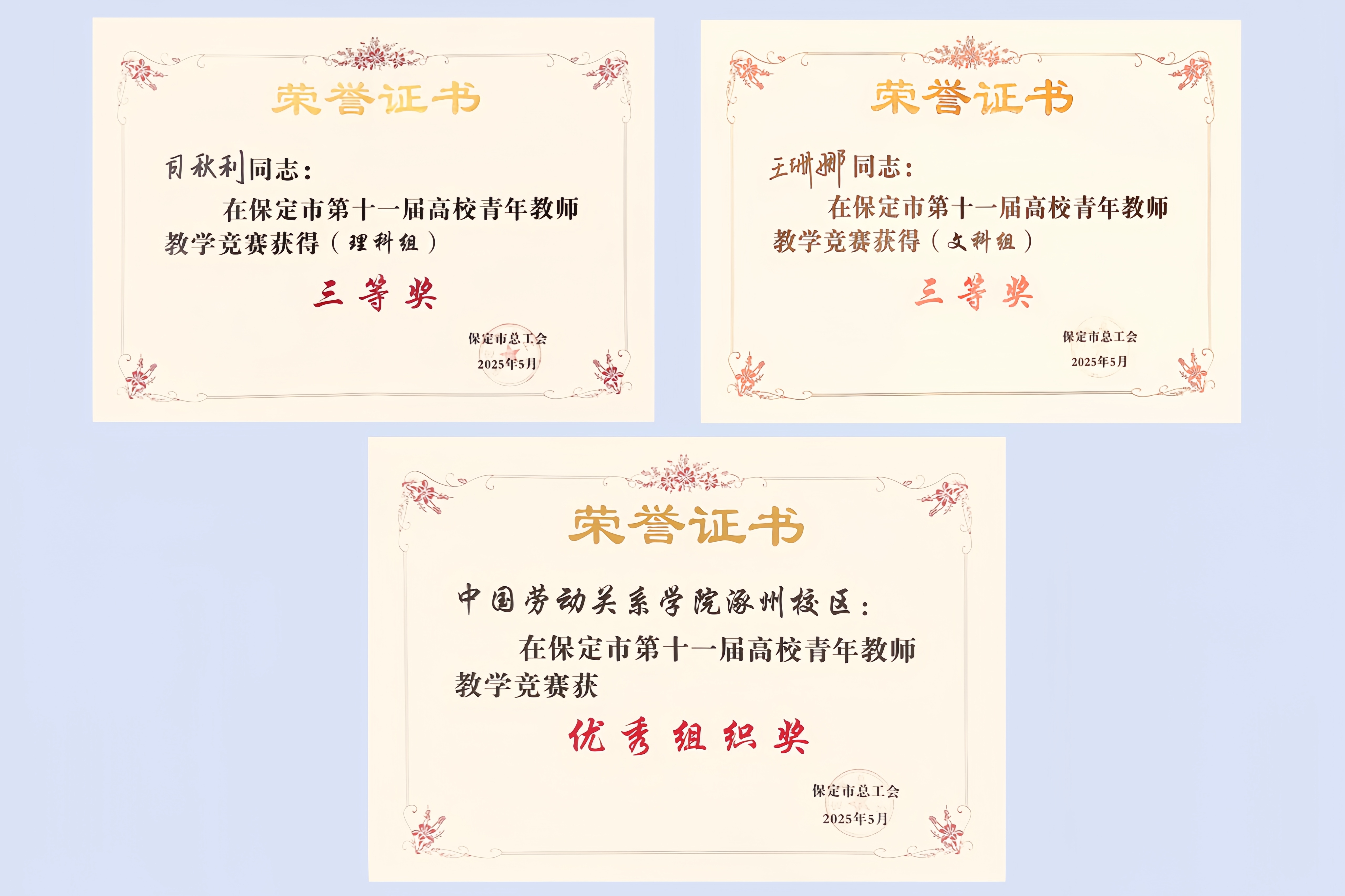 近日,我校教师在多项教学竞赛中表现优异,斩获佳绩:法学院教师李庚强在第五届北京高校教师教学创新大赛中,荣获新文科赛道中级及以下组优秀奖。劳动经济学院教师王珊娜、司秋利分别荣获第十一届保定市高校青年教师教学竞赛文科组三等奖和理科组三等奖;我校荣获第十一届保定市高校青年教师教学竞赛优秀组织奖。