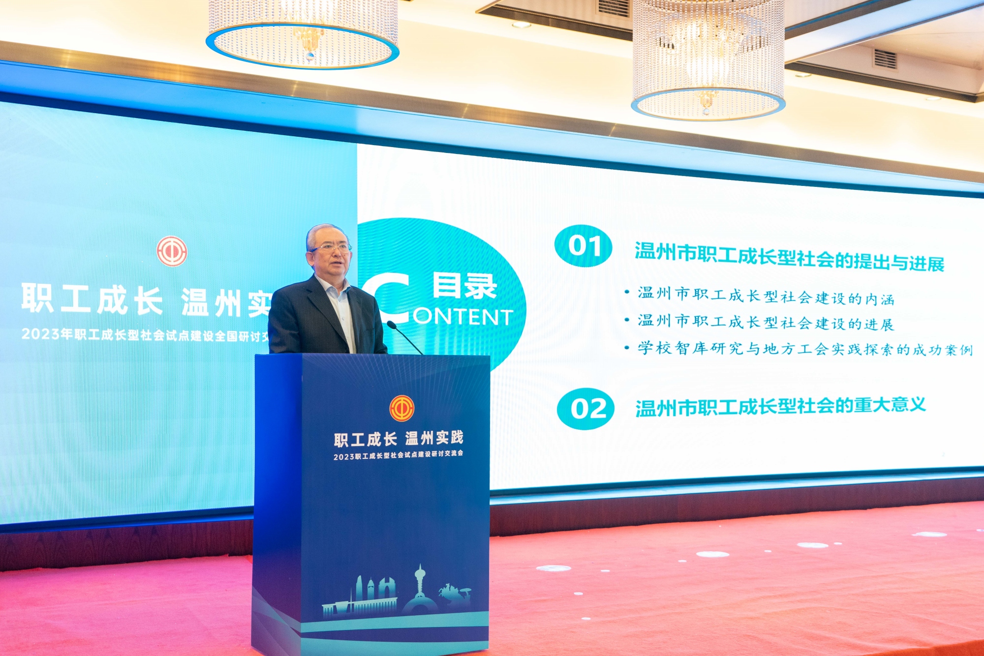 傅德印校长在题为《在新征程上谱写职工成长新篇章》的主旨演讲中指出,温州市职工成长型社会试点建设的重大意义,一是学习贯彻落实习近平总书记关于工人阶级和工会工作的重要论述的生动实践,在学习型社会建设、技能型社会建设、奋斗型社会建设、共享型社会建设、和谐型社会建设的架构中充分体现了以职工为中心的思想;二是全面深化产业工人队伍建设改革的创新探索,通过“五型”社会建设实现职工学有所成、技有所升、干有所值、创有所获、心有所依的目标;三是浙江高质量发展建设共同富裕示范区的重要举措,通过深化分配制度改革、健全就业扶持体系等举措探索将共同富裕的实质性进展体现在职工身上;四是为其他地区开展职工成长型社会建设提供了示范性经验,形成了因地制宜、一体化设计、根植职工需求、数量质量并举、点面结合相互促进等一系列经验举措。