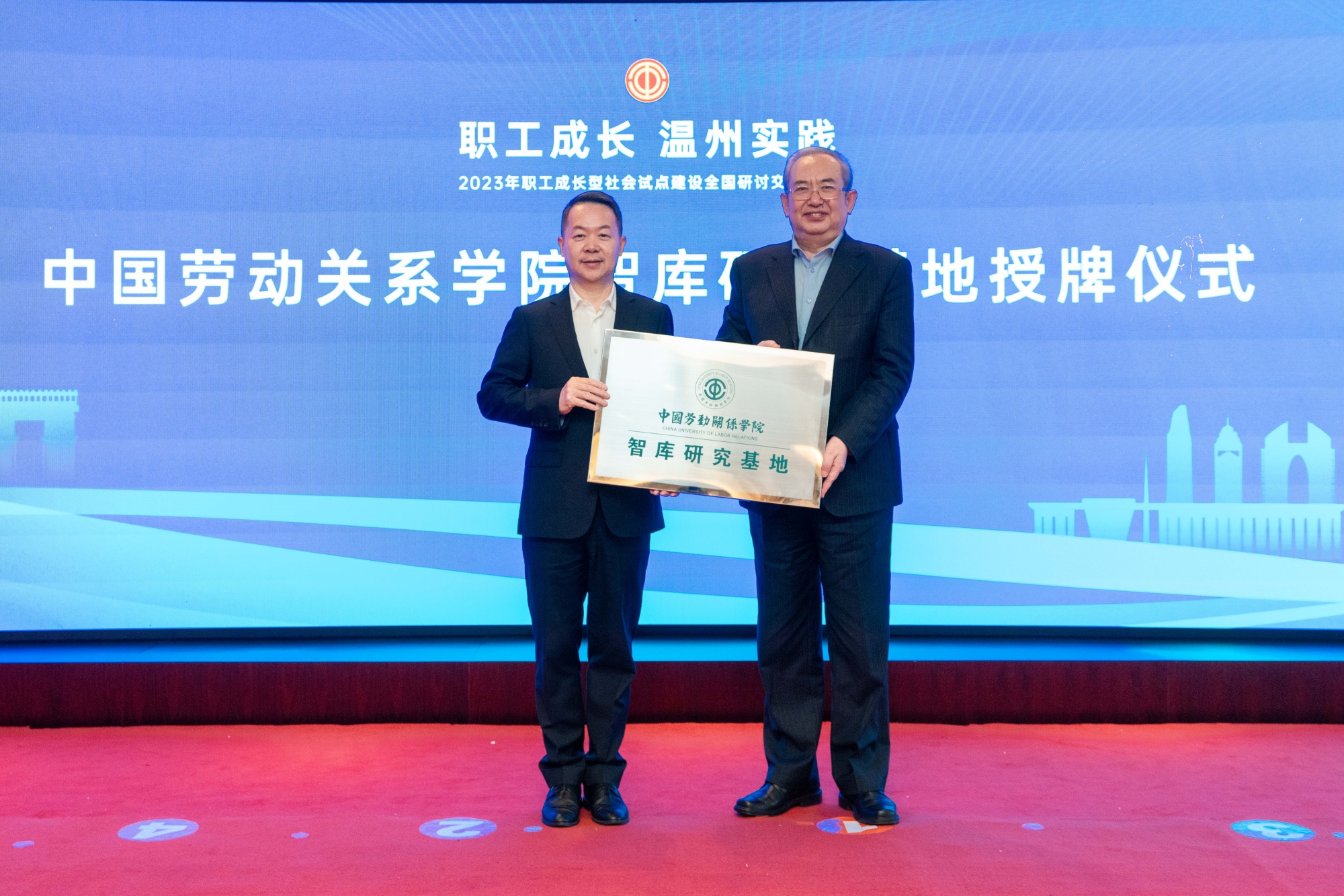 活动期间,还举行了中国劳动关系学院智库研究基地授牌仪式,温州市总工会正式成为我校智库研究基地成员之一。