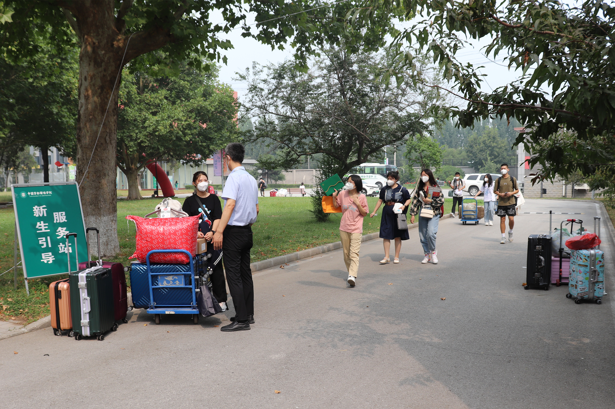 报到现场,新生经迎新专用入口依次完成“身份验证—体温检测—健康码查验—核酸检测”后,在志愿者引领下,到各自学院完成注册报到工作。在学校各个角落,校门口、咨询服务点、新生宿舍,随处可见教职工们、志愿者们忙碌的身影,为新生提供身份核验、校园引导、行李搬运、入校咨询等服务。