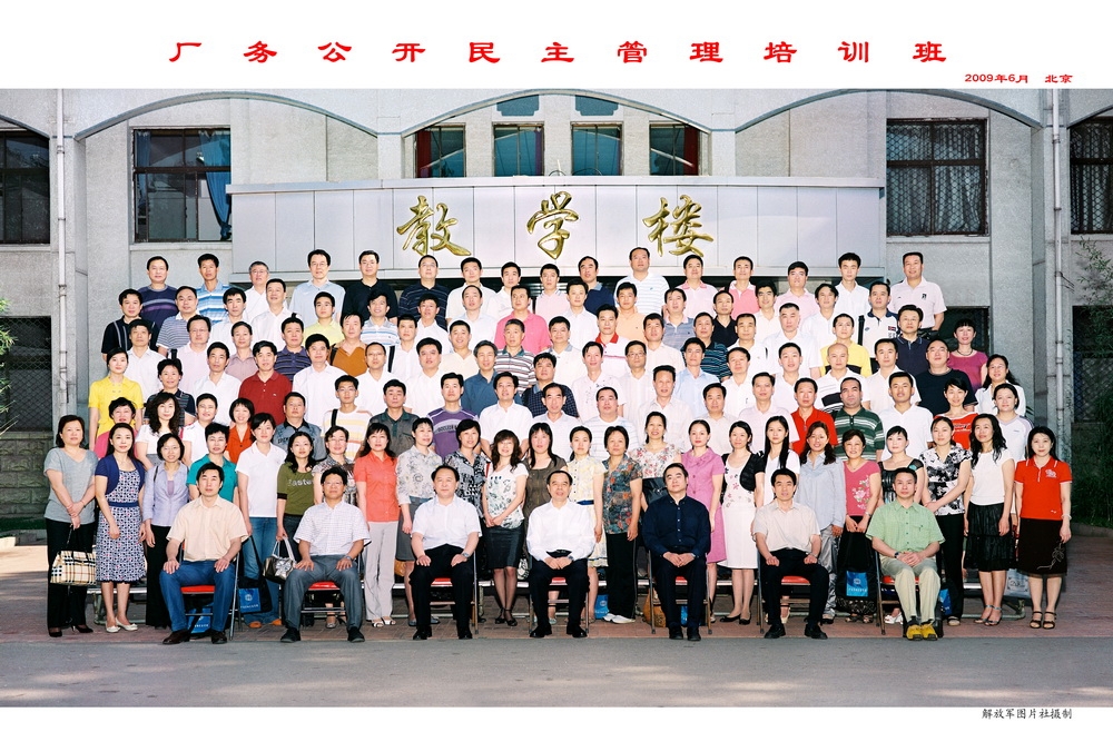 为进一步完善以职代会为基本形式的企事业单位民主管理制度,推进厂务公开,不断提高厂务公开民主管理工作水平,全总民主管理部于2009年5月31日至6月6日在我院举办为期一周的厂务公开民主管理培训班。全总副主席、书记处书记陈荣书同志与学员合影并发表讲话。