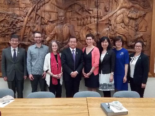 25日上午,康奈尔大学中国学生学者联合会组织部分师生与代表团进行了座谈。刘向兵校长介绍了我校概况及人才引进政策,希望能有更多优秀学子归国发展。乔健、姜颖、李桃分别就新常态下中国劳动关系的现状和趋势、中国留学生回国就业所面临的问题、开展双向暑期学生交流项目等问题与参加座谈的学生代表进行了互动交流。