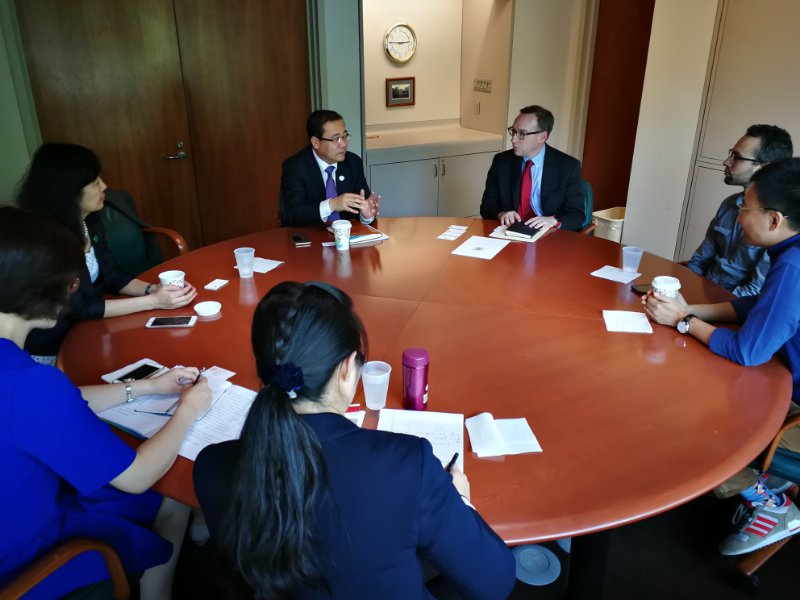 当天下午,康奈尔大学国际事务副教务长Laura Spitz女士和国际事务主任Laurie Damiani女士会见了代表团一行,并代表康奈尔大学对我校代表团表示欢迎。Laura女士首先介绍了康奈尔大学与中国合作交流的总体情况,以及对合作项目设计和发展的理念。刘向兵校长围绕我校历史沿革、行业背景、劳动学科特点等方面进行了介绍,表达了希望借助与ILR开展多元合作的契机、逐步与康奈尔大学建立更加深入、密切的联系。Laura女士表示赞同,并希望推动两校开展多层次交流。