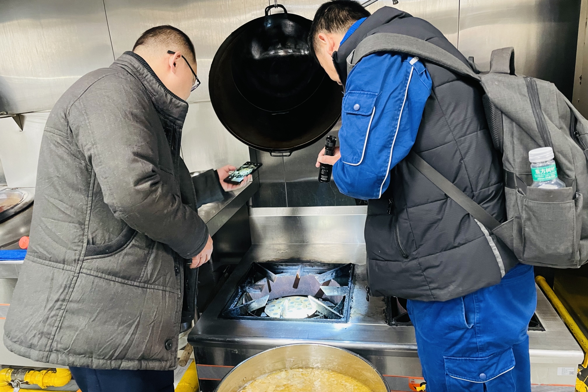 检查期间,检查组重点针对中控室、食堂后厨等区域,从专业人员值班值守、设备运行、隐患报警排查、用气场所安全、燃气使用管理、燃气设施安全运行、排烟管道油污清理、电气线路敷设规范性、安全出口及疏散通道堵塞等情况,燃气灶具等燃烧器合规性,可燃气体泄漏报警装置安装情况,燃气管道压力容器检定以及配备的消防救援设施进行全方位检查。