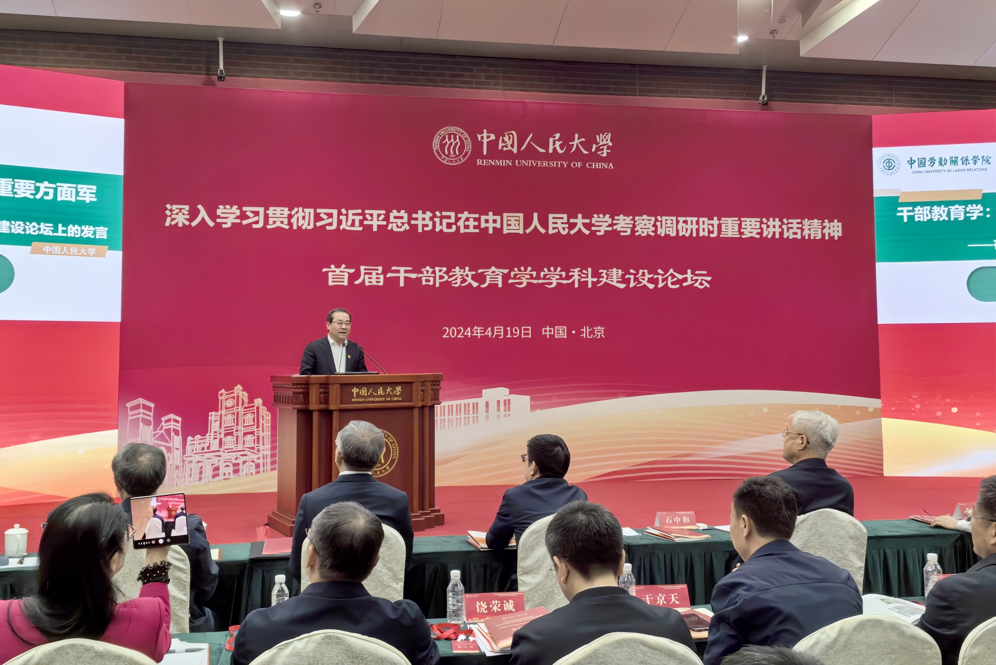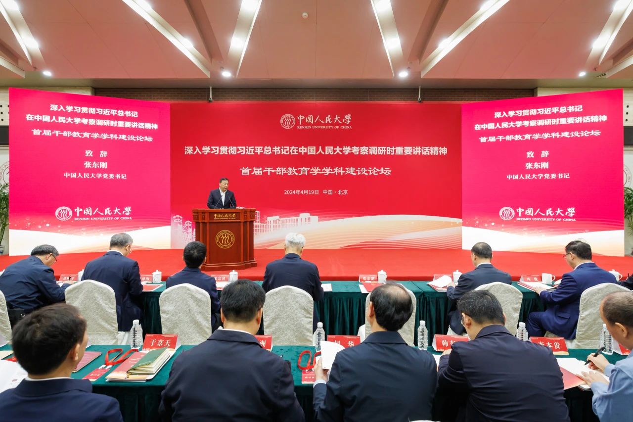 4月19日,中国人民大学首届干部教育学学科建设论坛在中国人民大学中关村校区举办,学校党委书记刘向兵出席论坛并做主题演讲。党委常委、副校长刘丽红,党委常委、工会干部培训学院院长戴筱筱参加论坛。