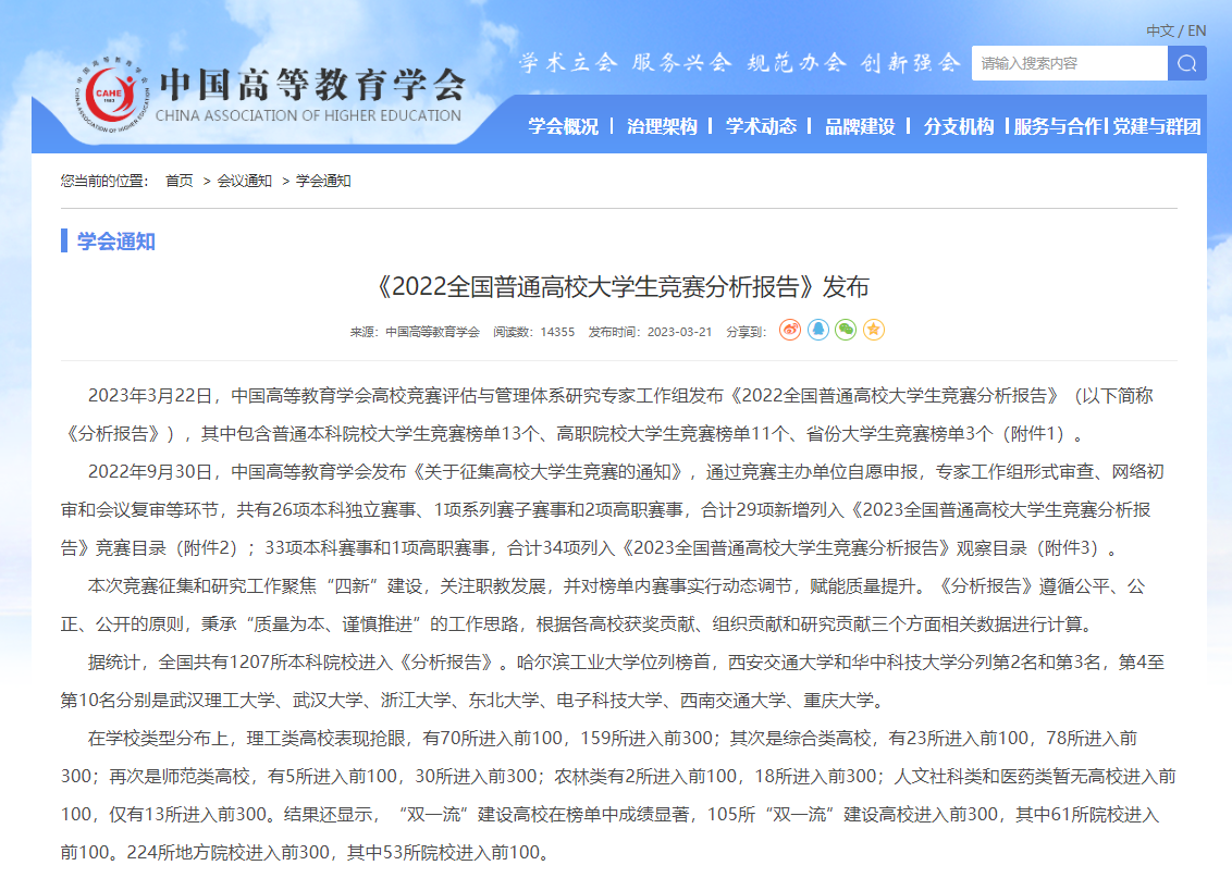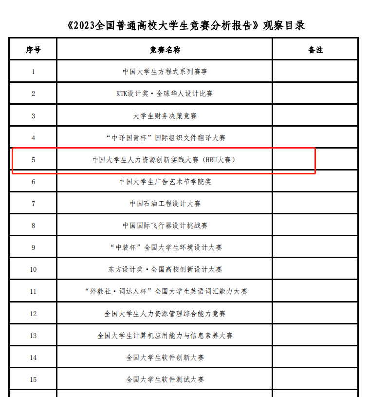 3月22日,中国高等教育学会高校竞赛评估与管理体系研究专家工作组发布《2022全国普通高校大学生竞赛分析报告》,由我校发起创办的中国大学生人力资源创新实践大赛(以下简称HRU大赛,原中国大学生人力资源职业技能大赛)通过学校申报、专家工作组形式审查、网络初审及会议复审等环节激烈角逐,成功入选《2023全国普通高校大学生竞赛分析报告》观察目录。