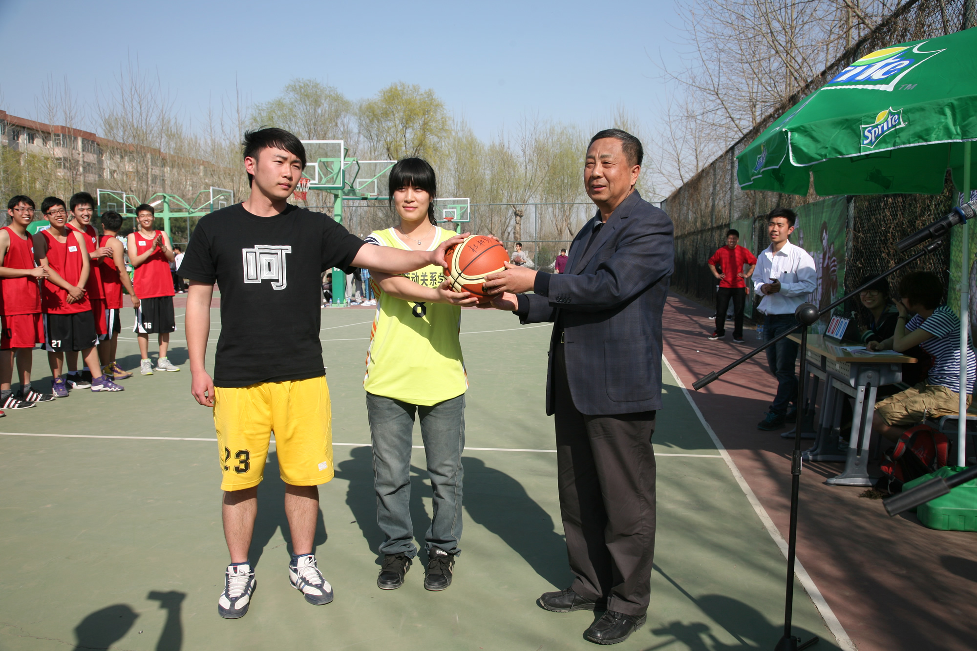 涿州校区党政办主任蔡惠良、基础部常务副主任赵子江教授接待了来访客人。他们向来宾汇报了涿州校区体育设施建设和体育文化建设情况,随后观看了在涿州校区篮球场由基础部副教授于秀玲主持的校园篮球赛开幕式、授球仪式。